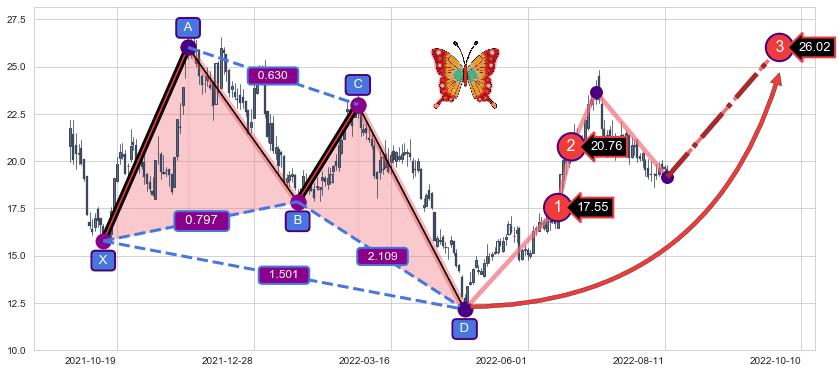 ➣ 已完成【蝴蝶】形态起点X: 2021-10-12, 终点D: 2022-04-26, 共133交易日