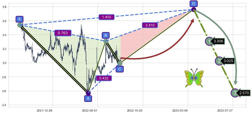 ➣ 未完成【蝴蝶】形态起点X: 2021-09-07, 已到达C点: 2022-08-10, 预测最终D点: 2023-03-28, 共387交易日