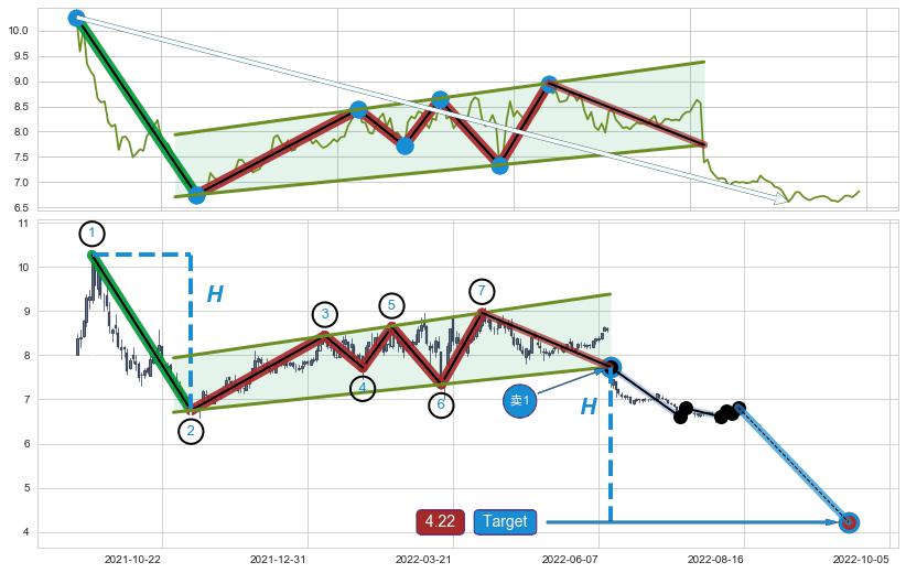 | 2 🅚:【毒蜘蛛】卖出点 ➕ 📐:升旗形下行突破支撑位破位, 猜想持续下沉下跌,被突破的支撑位已变为阻力位 ☞ 看空信号 ⇥ 【均线】交织【图形】⇥ 综合量化分数: 11 | > |