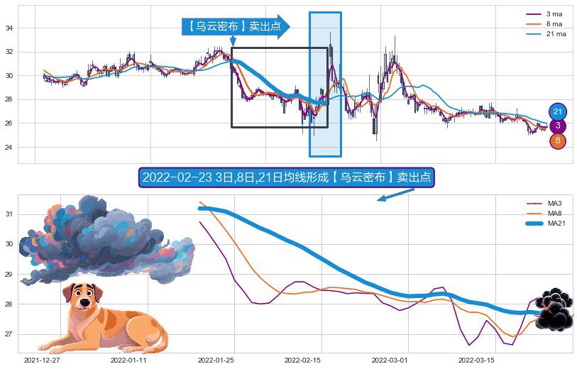 ⚀ 2022-01-19日-2022-03-23日显现 3日-8日-21日均线 【乌云密布】卖出点 看空信号,后市看跌,卖出