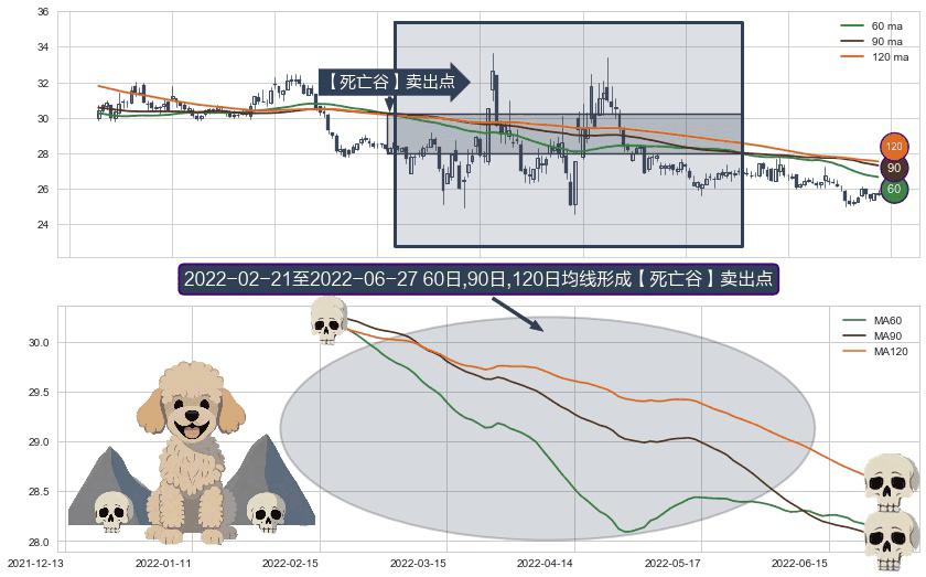 ⚀ 2022-02-22-日至2022-06-27-日显现 60日-90日-120日均线 【死亡谷】卖出点 看空信号,后市看跌,卖出