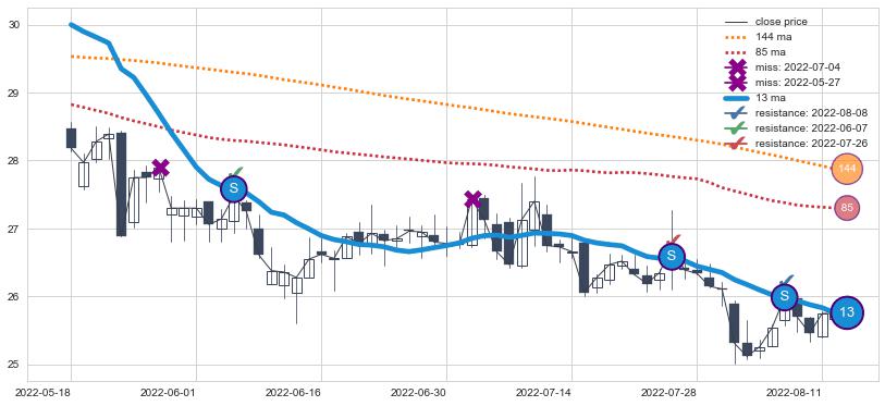 ⚂ 2022-03-25-日均线向上突破,2022-05-16-日重新下穿均线破位,均线阻力再次生效