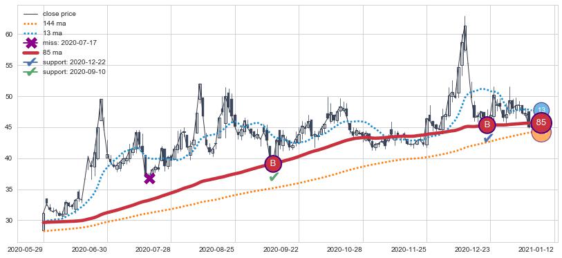 ⚁ MA3和MA8走势平行,且始终保持在短距离内,MA21始终在短中期均线上方,与短中期均线保持一定的距离,微微下行