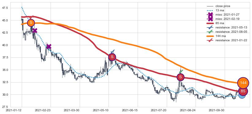 ⚀ 中期均线MA13下穿长期均线MA21形成的交叉是标准 死亡交叉