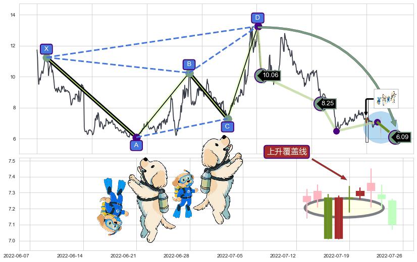 | 8 🅚:锤头线(锤子线) ➕ 📡:谐波蝴蝶临近目标❸:猜想到达后支撑临近(均值回复) ☞ 看多信号 ⇥ 【🅚线】交织【图形】⇥ 综合量化分数: 53 | > |