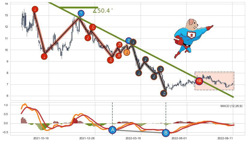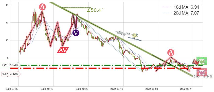 ♘ 支撑价格位6.87,可信任强度90.63%,距离最后交易2022-08-12形成的收盘价格7.09相差 -3.12%