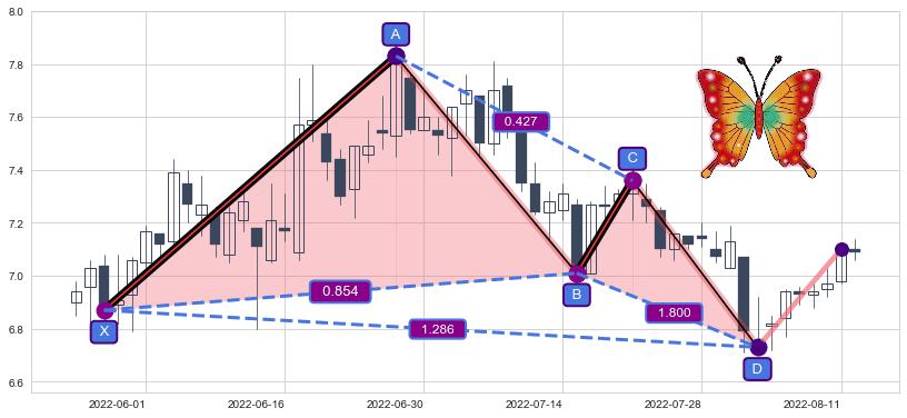 ➣ 已完成【蝴蝶】形态起点X: 2022-05-27, 终点D: 2022-08-03, 共48交易日