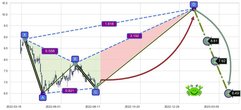 ➣ 未完成【螃蟹】形态起点X: 2022-03-22, 已到达C点: 2022-08-03, 预测最终D点: 2023-01-24, 共214交易日