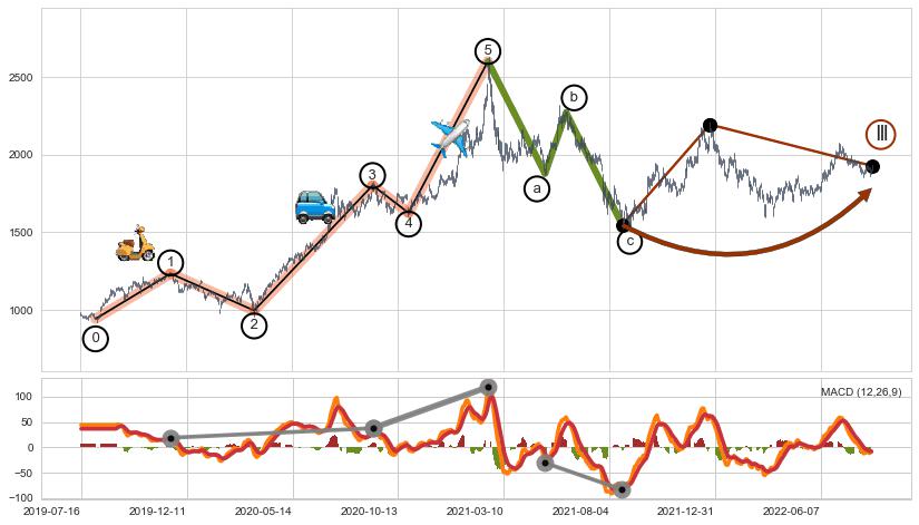 ➣ a,c调整浪MACD, RSI, KDJ走势都【未出现】背离,abc走势延续, 5浪反转概率增强
