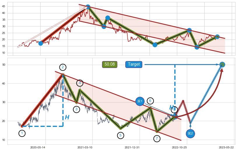 ➢ 【仅预测突破】最后价格:21.91与预测突破价格:22.37→【空间临近】后续最小【整理】第一目标价格→(2023-05-22: 50.08 )