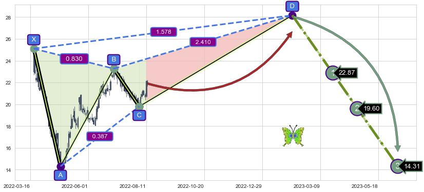 ➣ 未完成【蝴蝶】形态起点X: 2022-03-21, 已到达C点: 2022-08-03, 预测最终D点: 2023-02-03, 共223交易日