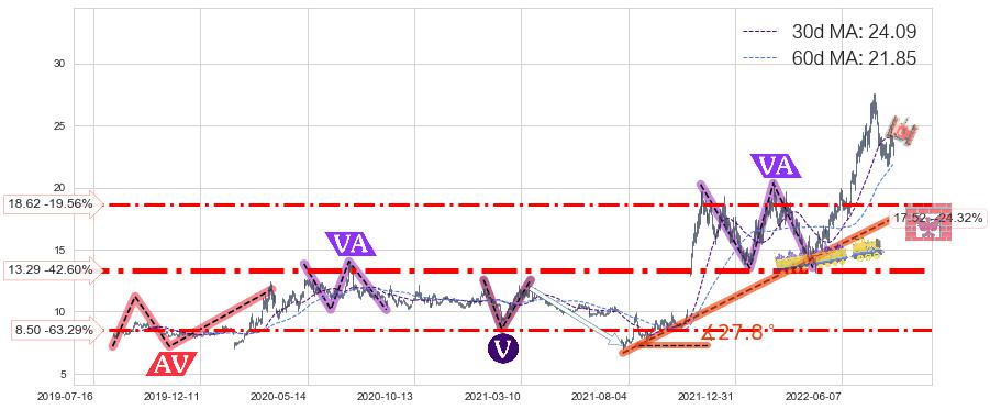 ♞ 30日均线:24.09,60日均线:21.85→ 快线>慢线