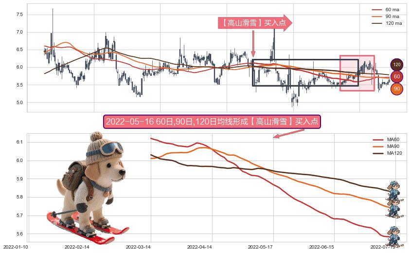 ⚀ 2022-03-14日-2022-07-11日显现 60日-90日-120日均线 【高山滑雪】买入点 看多信号,后市看涨,买入