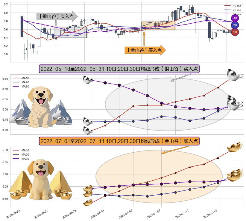 ⚃ 2022-07-04-日至2022-07-14-日显现 10日-20日-30日均线 【金山谷】买入点 其再次确认了买入信号,可靠性更强,买入
