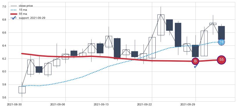 ⚅ 卖点向下突破均线后,价格走势有持续向下的迹象,但动能稍显不足,迟迟不能远离均线