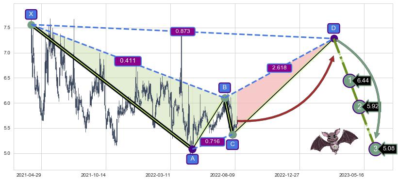 ➣ 未完成【蝙蝠】形态起点X: 2021-04-07, 已到达C点: 2022-08-03, 预测最终D点: 2023-03-10, 共470交易日