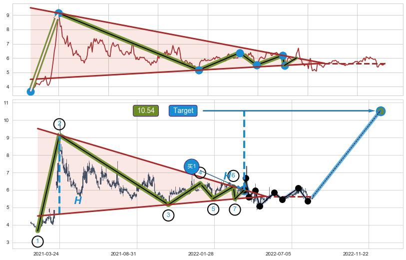 ➣ D点拟合预测价格7.28,距离最后交易收盘价格5.64相差 +29.10%
