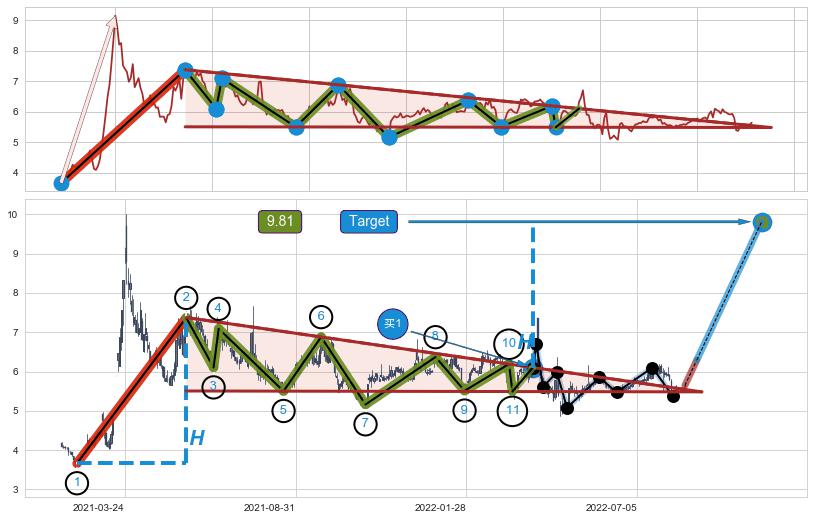 ➢ 【买1】: 激进型 买点 →(2022-03-31: 6.01 )形成突破上升【对称】三角形整理【整理】形态