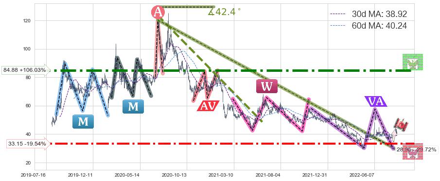 ♘ 支撑价格位33.15,可信任强度73.63%,距离最后交易2022-08-12形成的收盘价格41.20相差 -19.54%