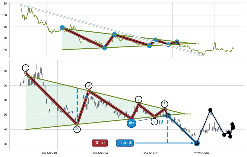 ➢ 最小中继整理跌幅→𝐇: 25.04 (低点逐步抬高斜边第一支撑点②与阻力边垂直距离)