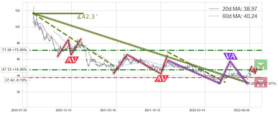 ♘ 阻力价格位47.12,可信任强度55.59%,距离最后交易2022-08-12形成的收盘价格41.20相差 +14.36%