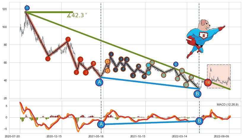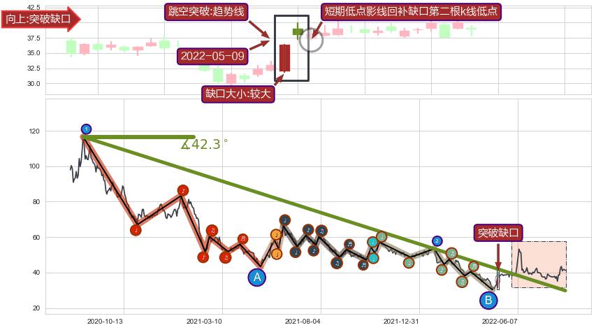 从2020-08-07至2022-05-24,共包含433个交易日,阶段股价下跌-95.58%,阶段股价变动位移路程比: 1 : 9,下跌趋势角度: 42.3