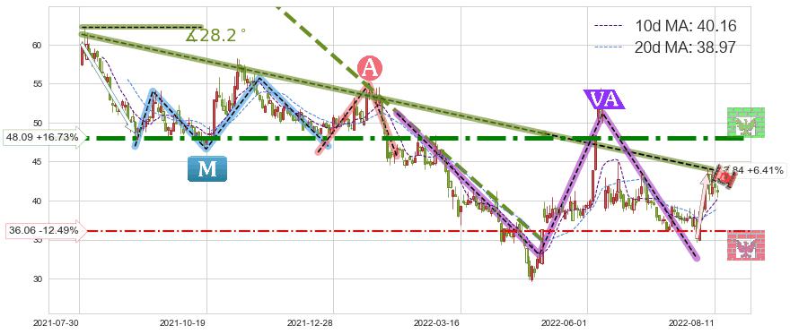 ♘ 阻力价格位48.09,可信任强度93.42%,距离最后交易2022-08-12形成的收盘价格41.20相差 +16.73%