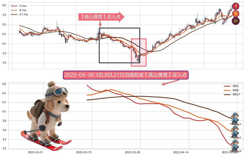 形态多维评估: ⚀ 2022-03-14日-2022-04-27日显现 3日-8日-21日均线 【高山滑雪】买入点 看多信号,后市看涨,买入