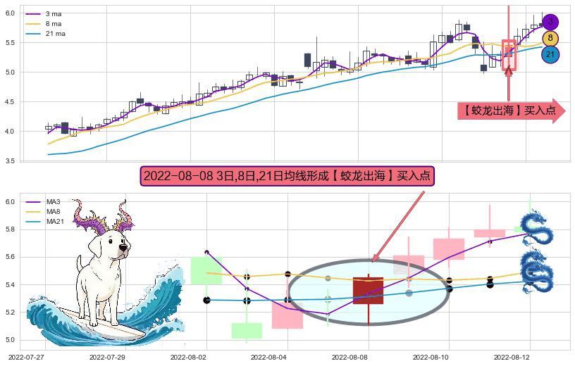 形态多维评估: ⚀ 2022-08-08日显现 3日-8日-21日均线 【蛟龙出海】买入点 看多信号,后市看涨,买入
