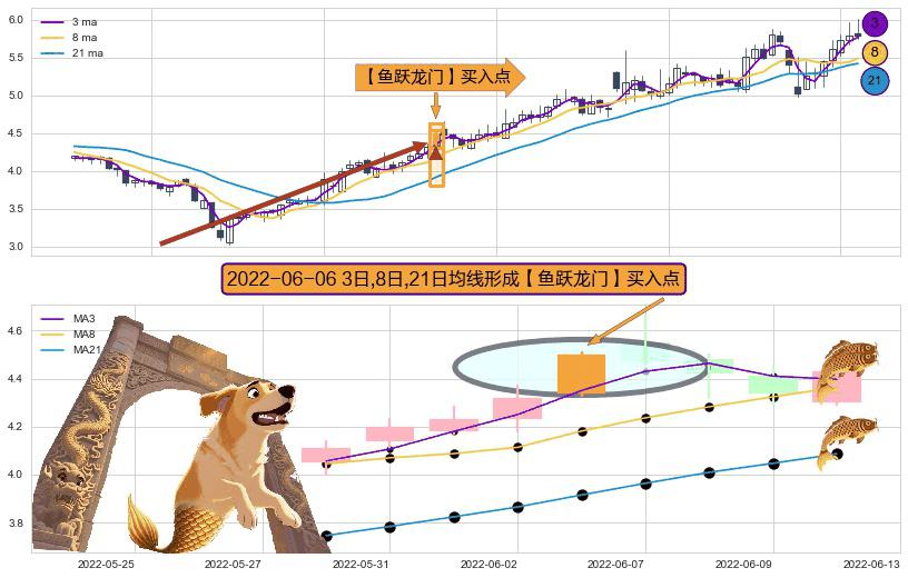 形态多维评估: ⚀ 2022-06-06日显现 3日-8日-21日均线 【鱼跃龙门】买入点 看多信号,后市看涨,买入