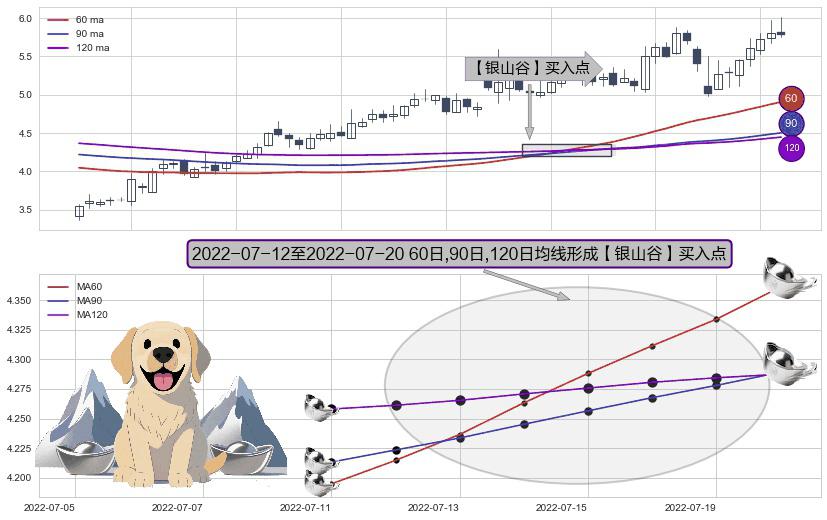 形态多维评估: ⚀ 2022-07-13-日至2022-07-20-日显现 60日-90日-120日均线 【银山谷】买入点 看多信号,后市看涨,买入