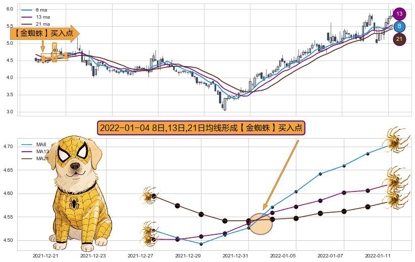 形态多维评估: ⚀ 2022-01-04日显现 8日-13日-21日均线 【金蜘蛛】买入点 看多信号,后市看涨,买入