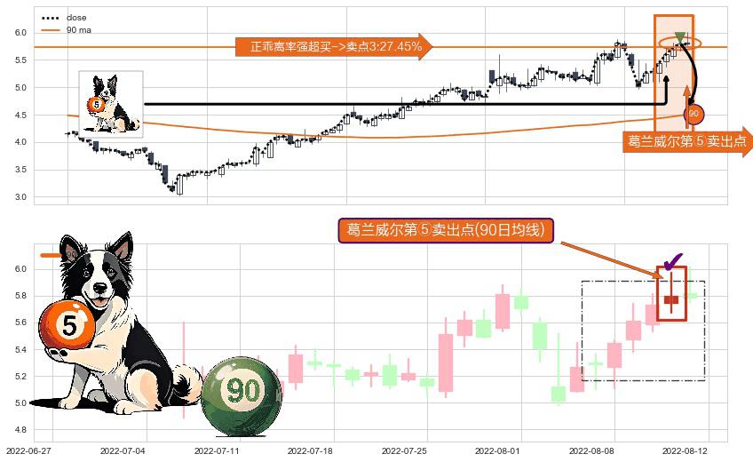 形态多维评估: ⚀ 2022-08-11-日显现 葛兰威尔均线 90日均线 第⑤卖出点 上升趋势均值回复的短线回落信号,后市看跌,卖出信号