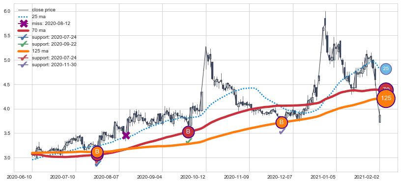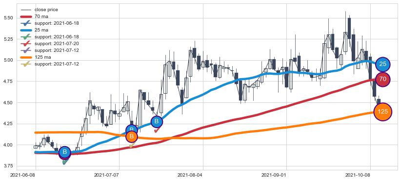 上涨趋势2021-06-08-2021-10-12,均线25, 125, 70确认关键支撑3处