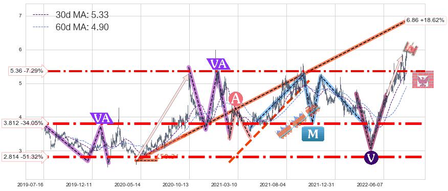 ♘ 支撑价格位3.812,可信任强度99.00%,距离最后交易2022-08-12形成的收盘价格5.78相差 -34.05%