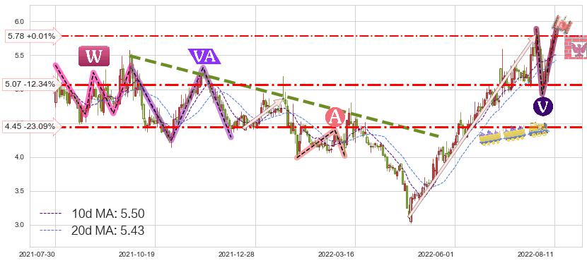 ♘ 支撑价格位5.78,可信任强度54.47%,距离最后交易2022-08-12形成的收盘价格5.78相差 +0.01%