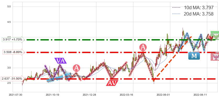 ♘ 阻力价格位3.917,可信任强度90.69%,距离最后交易2022-08-12形成的收盘价格3.850相差 +1.73%