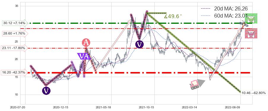 ♘ 阻力价格位30.12,可信任强度71.72%,距离最后交易2022-08-12形成的收盘价格28.11相差 +7.14%