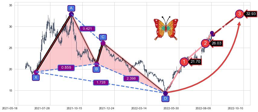 ➣ 已完成【蝴蝶】形态起点X: 2021-06-28, 终点D: 2022-04-26, 共202交易日