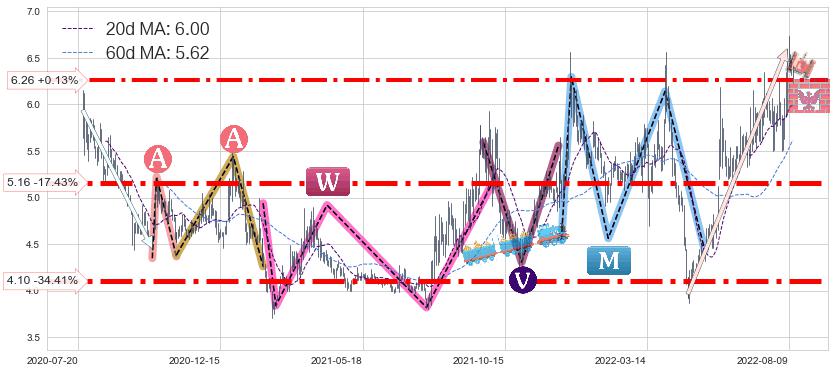 ♘ 支撑价格位5.16,可信任强度93.53%,距离最后交易2022-08-12形成的收盘价格6.25相差 -17.43%