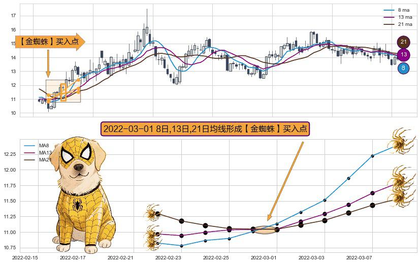 形态多维评估: ⚀ 2022-03-01日显现 8日-13日-21日均线 【金蜘蛛】买入点 看多信号,后市看涨,买入