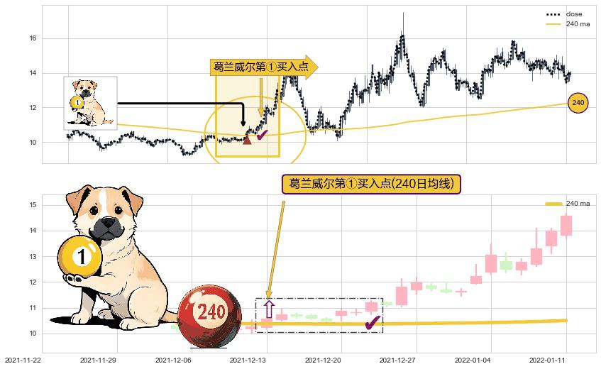 形态多维评估: ⚀ 2021-12-13-日显现 葛兰威尔均线 240日均线 第买①入点 走势反转见底信号,后市看涨,买进信号