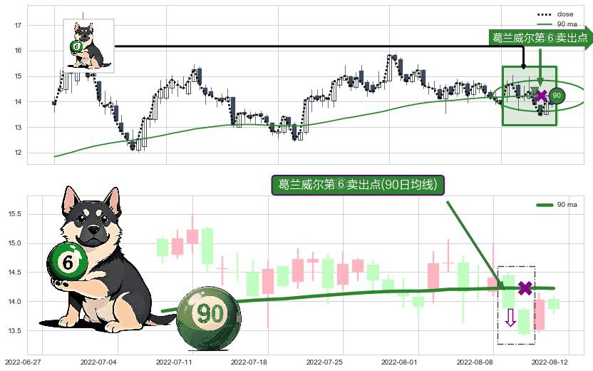 形态多维评估: ⚀ 2022-08-09-日显现 葛兰威尔均线 90日均线 第⑥卖出点 走势反转见顶信号,后市看跌,卖出信号