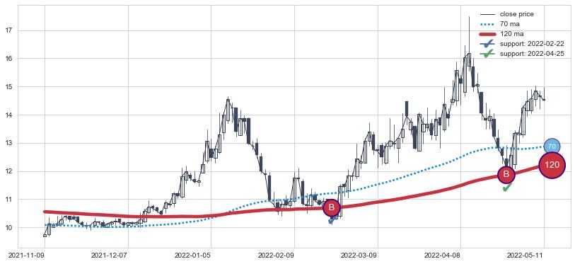 上涨趋势2021-11-09-2022-05-11,均线120确认关键支撑2处