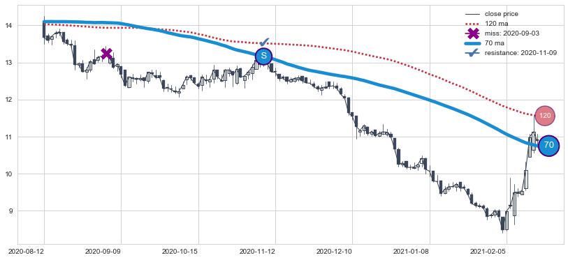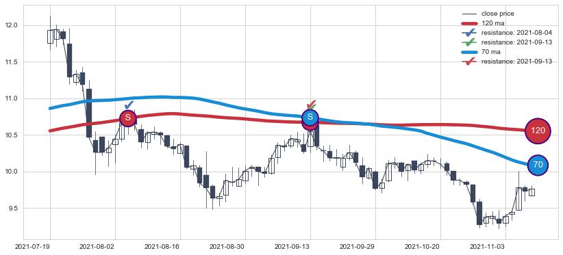 下跌趋势2021-07-19-2021-11-09,均线120, 70确认关键阻力2处