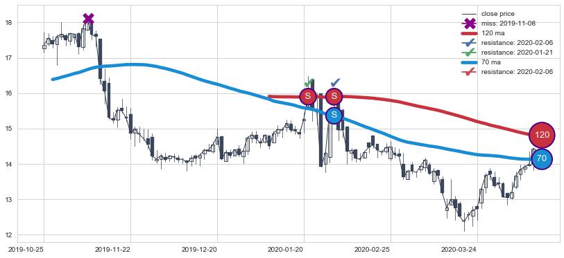 下跌趋势2019-10-25-2020-04-13,均线120, 70确认关键阻力2处