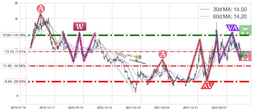 ♘ 支撑价格位13.70,可信任强度52.20%,距离最后交易2022-08-12形成的收盘价格13.87相差 -1.21%