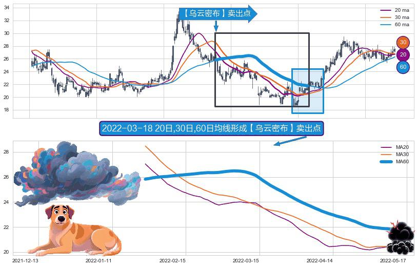 ⚀ 2022-01-24日-2022-05-12日显现 20日-30日-60日均线 【乌云密布】卖出点 看空信号,后市看跌,卖出
