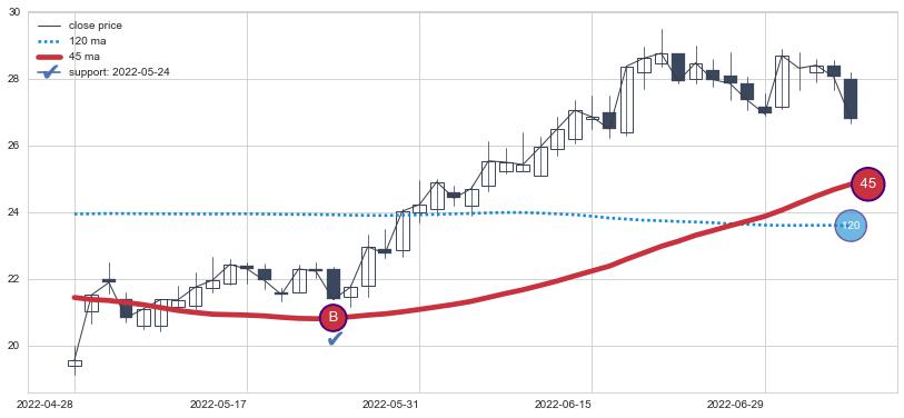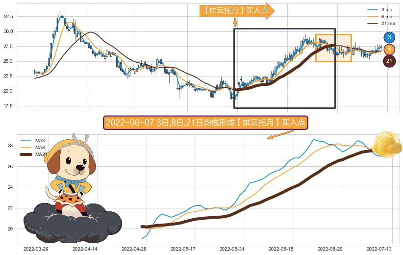 ⚀ 2022-04-27日-2022-07-11日显现 3日-8日-21日均线 【烘云托月】买入点 看多信号,后市看涨,买入