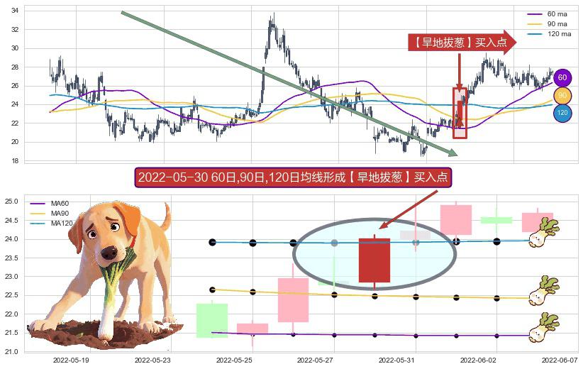 ⚀ 2022-05-30日显现 60日-90日-120日均线 【旱地拔葱】买入点 看多信号,后市看涨,买入